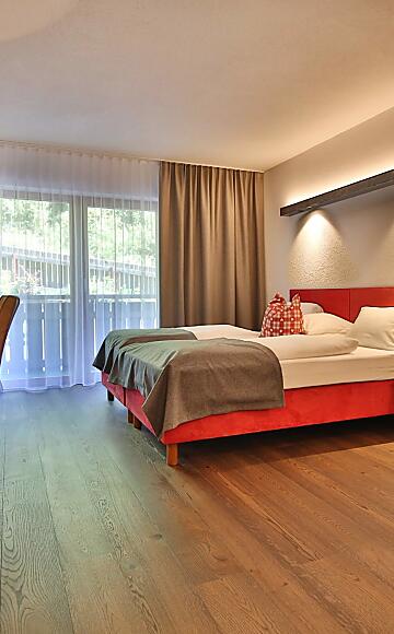 Im Doppelzimmer Wiesenblick Superior genießen Sie Naturholzboden oder Naturteppich und den Blick auf die Hotelwiese von Ihrem Balkon mit Blick auf den Innenhof.