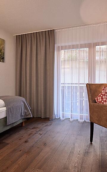 Kuscheliges Einzelzimmer mit Naturholzboden und Balkon mit Blick auf den Innenhof.