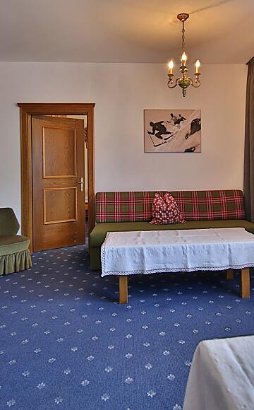 Familiensuite bestehen aus Elternschlafzimmer und Kinderschlafzimmer mit separaten Wohnzimmer. Ein Vorraum verbindet die Räume. Kühlschrank, Sat-Flachbild-TV, WLAN. Großzügiges Badezimmer mit Badewanne, Bidet, Haartrockner, Kosmetikspiegel, getrenntes WC. Großer Sonnenbalkon mit dem perfekten Blick auf die Berge. Kurtaxe 2,20 € exklusive.