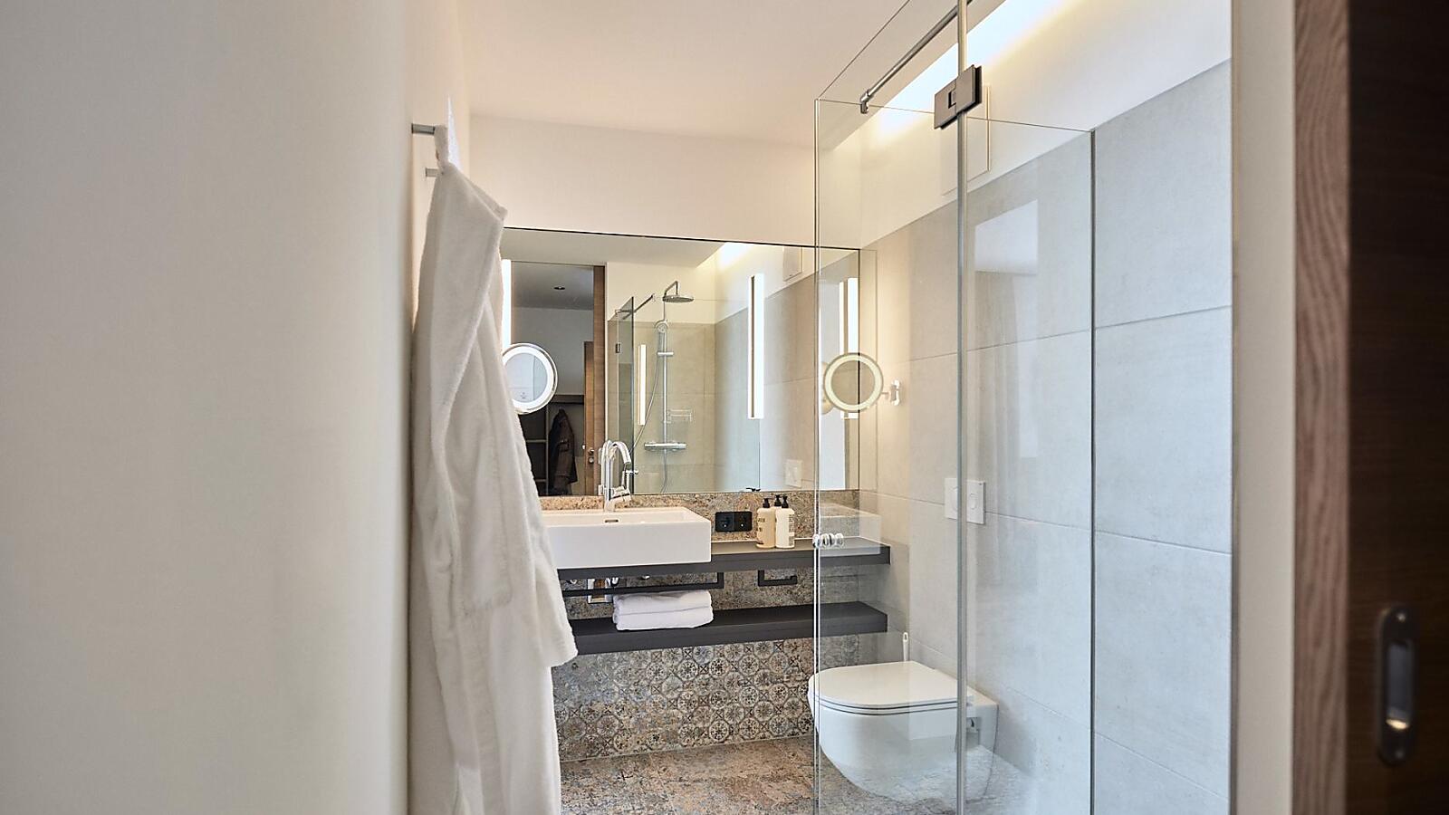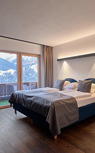 This exclusive suite is ideal for all those who wish to treat themselves to private wellness pleasures. The luxury bathtub in the room with a view of the surrounding mountain world and the two bathrooms with generous showers invite you to feel good. Space for the whole family. Cosy corner. Minibar.